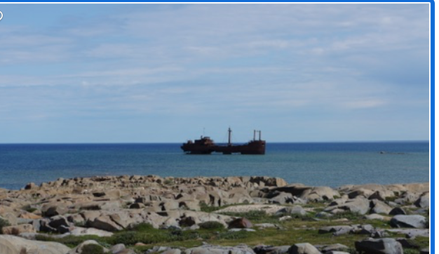 Judd drove the bus about fifteen miles outside of Churchill to where the Tundra Crawler is parked. This machine is massive. It looks like a school bus on steroids. It has a large bus like body with bench seats, a propane heater, washroom and a small patio at the rear. The wheels alone of this machine are six feet high and it is powered with a caterpillar motor. Of course, Judd was the driver and Jason was the photographer. We crawled along a small trail stopping occasionally to view sandhill cranes, eagles and falcons. Unfortunately we did not see any bears. At one point we stopped at a beach on the bay and did some beachcombing under the watchful eye of Judd. She then drove us out to a view point to show us the remains of a beached freighter that was sitting on the rocks near shore.