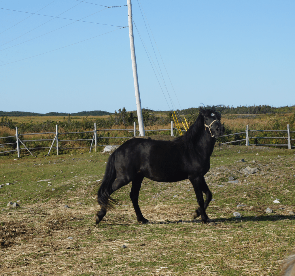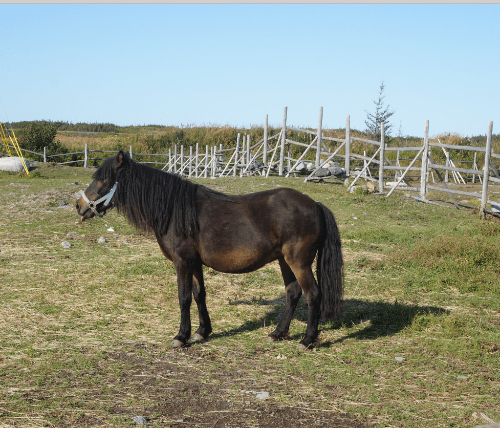 As we got near the village, we stopped in at the Newfoundland pony refuge. The Newfoundland pony is considered to be the only purebred horse native to Newfoundland. They are distinctly a smaller horse in size. They are larger than a Shetland pony and have different colors. They are used locally for pulling firewood out of the bush, and they pull sleds of firewood in the winter. They have also been used to plow small fields on the island.