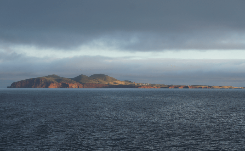 The five-hour ferry ride is on a large ferry that is the main supplier of goods and people to the island. Several transport trucks were shuffled onto the ferry however, there were not many passengers aboard as we are late in the tourist season. We later learned that the population of Isle di La Madeleine is about 12,000 people, but in the summer months this increases to approx. 80,000!! This ferry would definitely be busy during the summer months. The main language on the ferry is French, however, the personnel are somewhat bilingual and the announcements are in both official languages. We enjoyed a late lunch on board and then we read and relaxed. As we approached the islands, we first went past Entree Island. This island looms high above the ocean with bright red cliffs covered in green pastures. The only access to this island is by a small ferry. Approx. one hundred folks live on this island whose main industry is fishing and farming. There are no young people on this island and the population continues to dwindle.